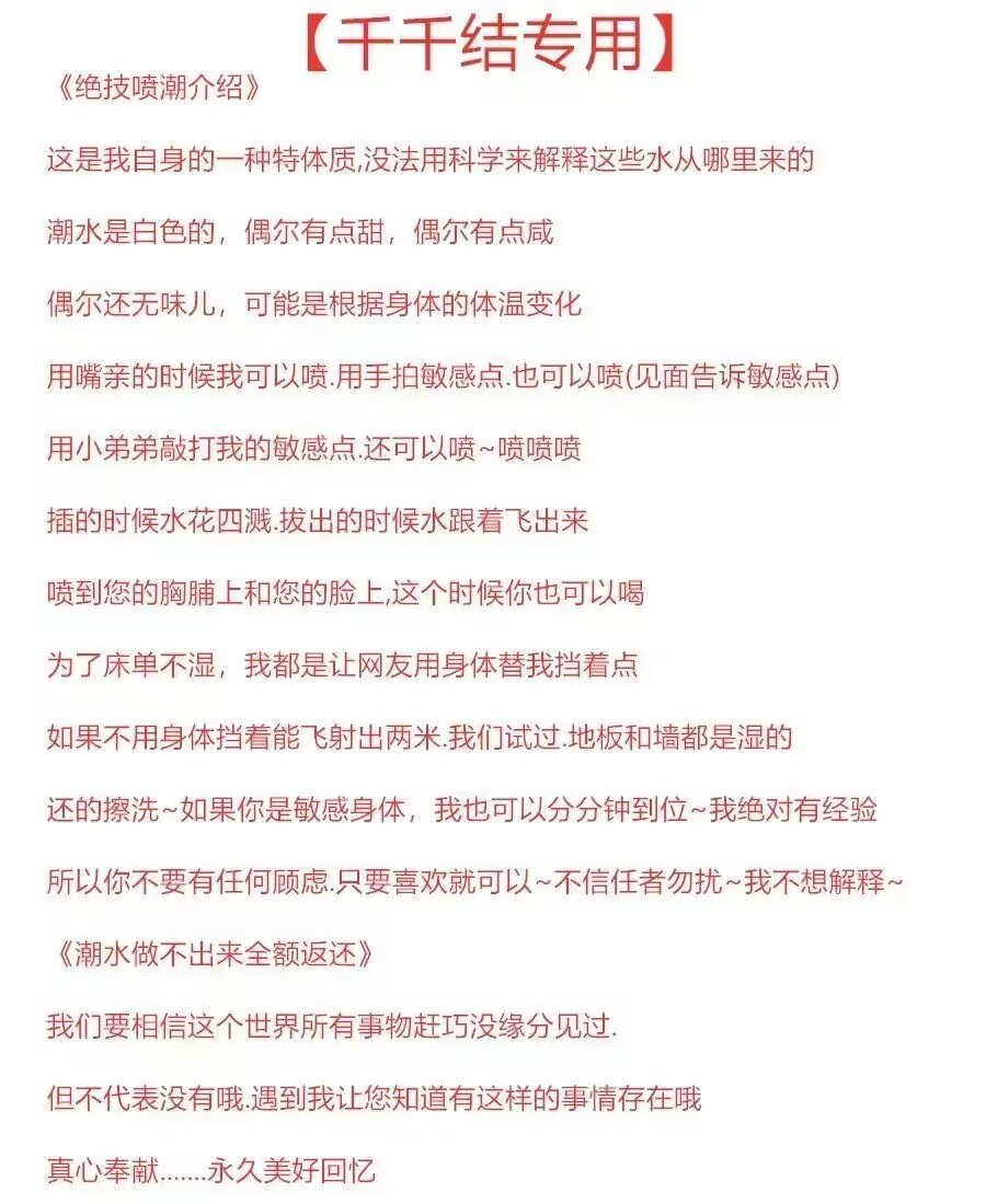 在别的地方看到的,这大姐应该年龄不小了,写的倒是挺牛逼的,但是说什么她潮喷的水能喝卧槽真的离大谱。有